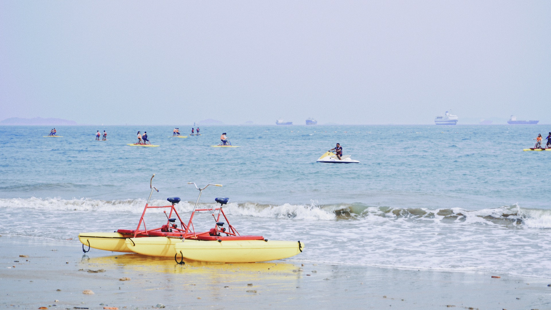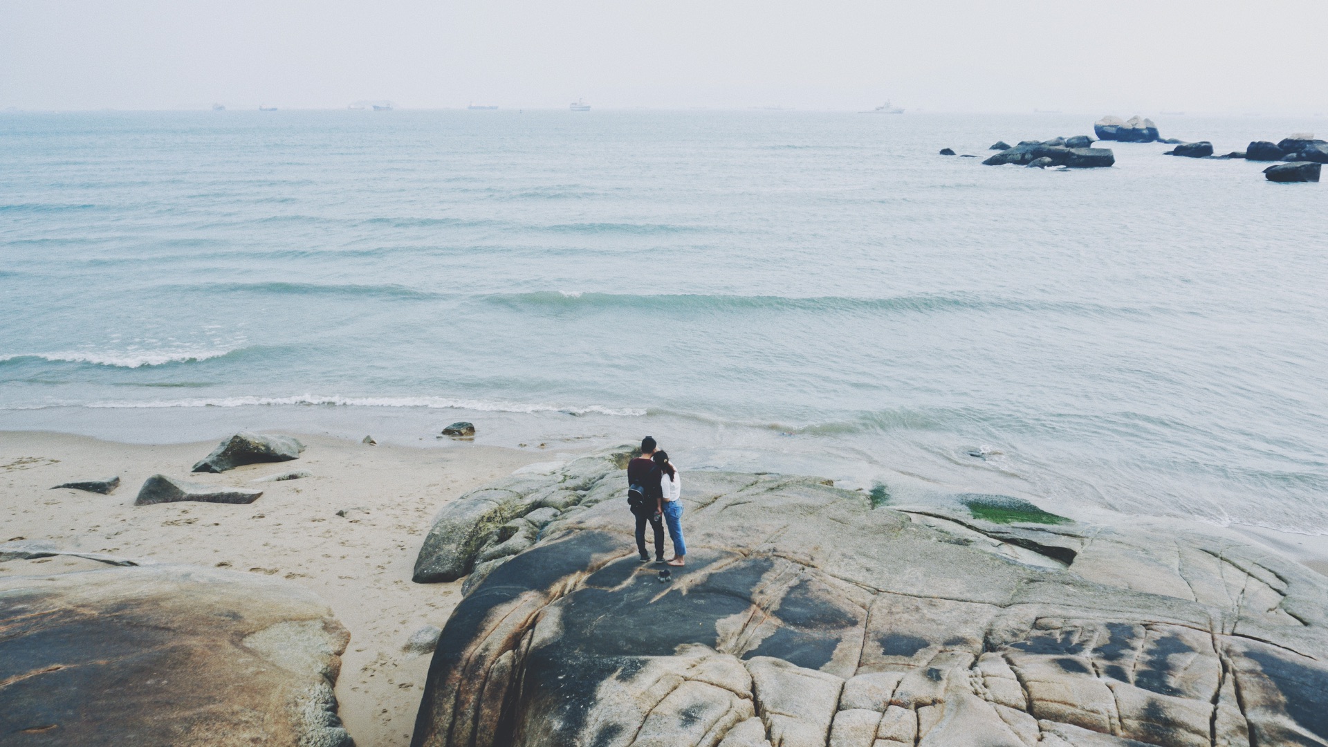 踩着咯吱的木栈道边走边看,这可能是在海边最有意思的休闲活动了,因为你能看见各种各样的人!卷起裤腿和海浪追赶不时来个趔趄的胡茬男,一定要用沙堆起什么东西的拧眉小孩子,发丝飞扬面朝大海的冥想少女...旁边的几个人在湿润的沙滩上写了一些什么字然后热烈地笑着,我想,这也许是他们的毕业旅行吧?那边的大石头上坐着一位正在拍婚纱照的,有点倦容的新娘,前面围起来的人是在干什么呢?哦,拨开人群你看见一个穿花衬衫的吉他歌手,正闭眼唱着一首你听过或者没听过的英文歌。
